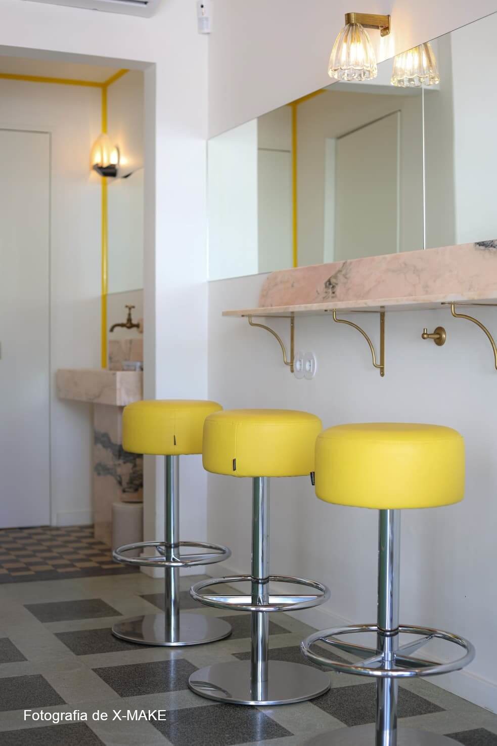 Design de interiores arrojado, combinando mármores únicos, azulejos feitos à mão e acabamentos em latão com a máxima exigência técnica comercial.